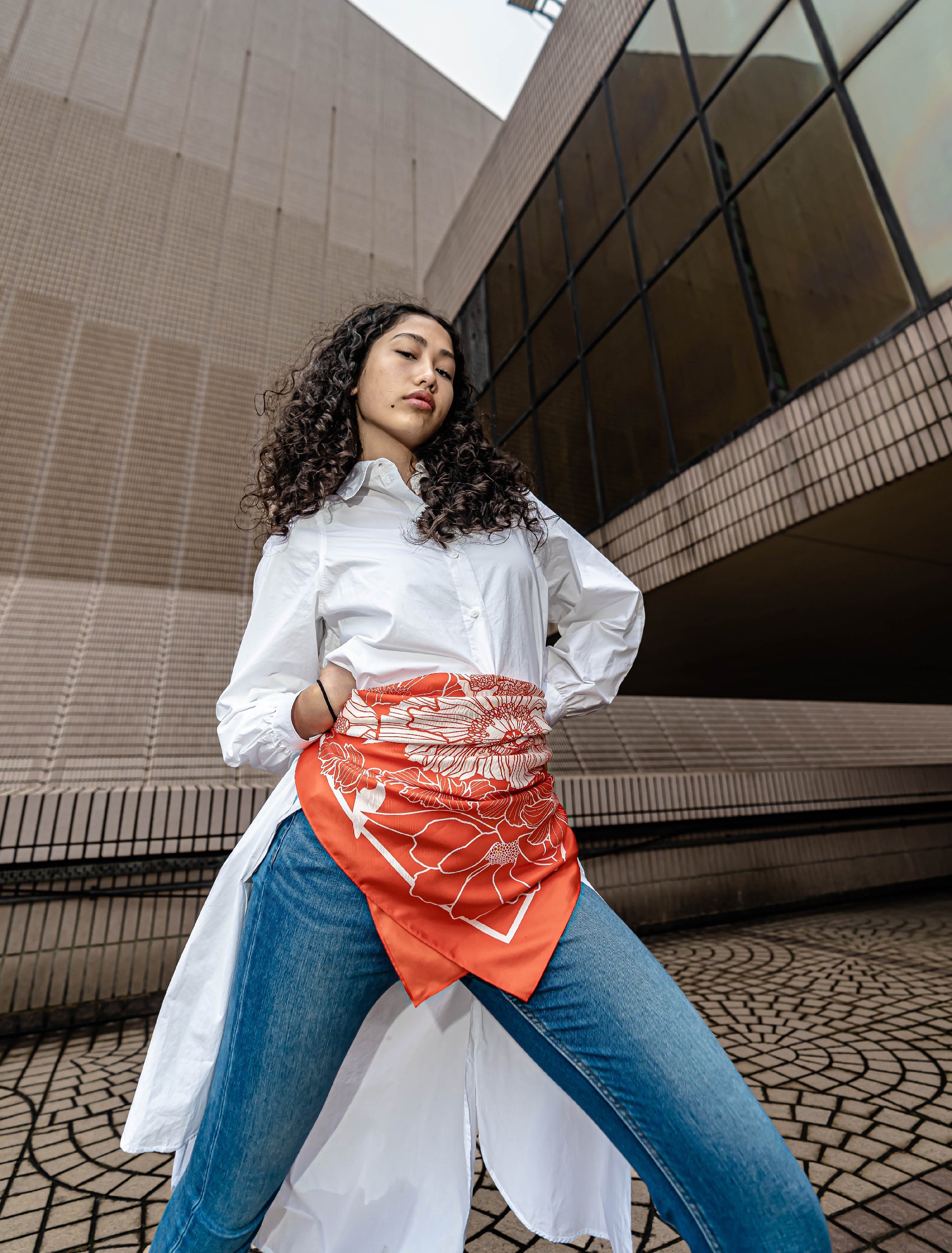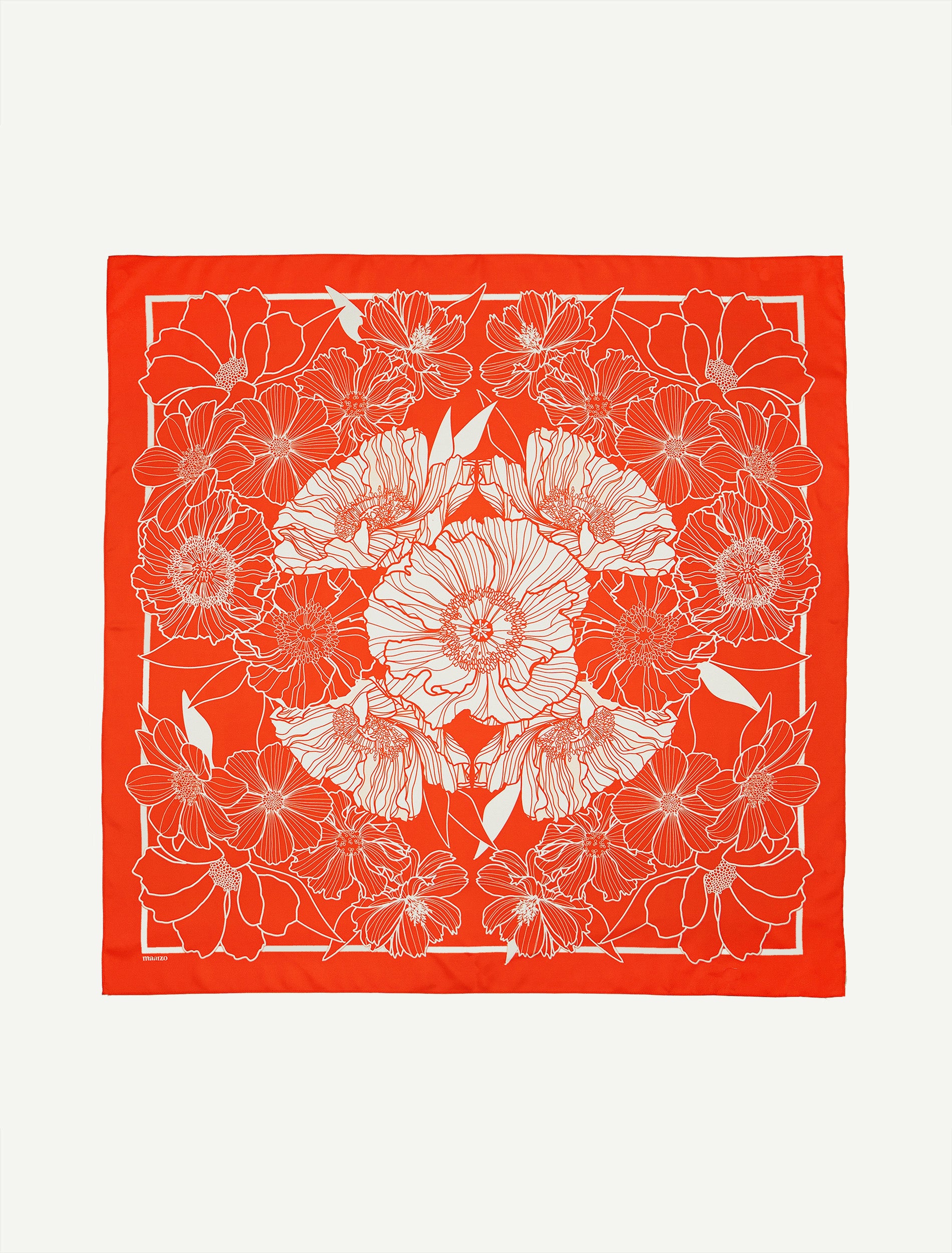 The Franca scarf is adorned with a beautiful and bold poppy design in a range of vibrant colors that will brighten up any outfit. With its generous size of 90x90 cm, this scarf offers many styling options, making it a versatile and practical accessory. Whether tied around the neck, head or even worn as a bandeau top, the Franca scarf adds a pop of color and a touch of femininity to any look. In addition, the high-quality silk material ensures that this scarf is soft, lightweight, and comfortable to wear, making it a perfect accessory for any season. Be sure to check out the styling page for more tips on how to wear the Franca scarf and make it a statement piece in your wardrobe.