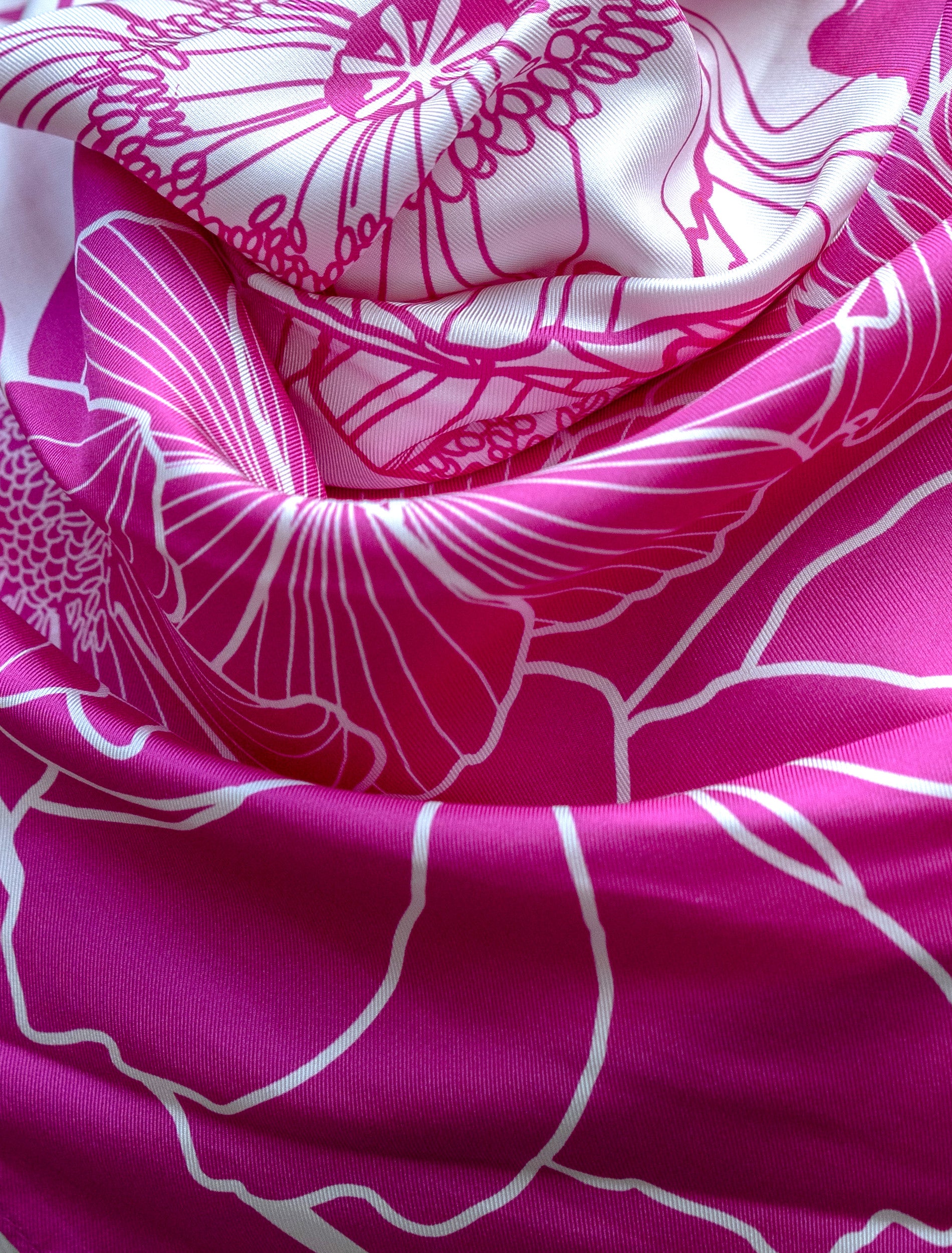 The Franca scarf is adorned with a beautiful and bold poppy design in a range of vibrant colors that will brighten up any outfit. With its generous size of 90x90 cm, this scarf offers many styling options, making it a versatile and practical accessory. Whether tied around the neck, head or even worn as a bandeau top, the Franca scarf adds a pop of color and a touch of femininity to any look. In addition, the high-quality silk material ensures that this scarf is soft, lightweight, and comfortable to wear, making it a perfect accessory for any season. Be sure to check out the styling page for more tips on how to wear the Franca scarf and make it a statement piece in your wardrobe.